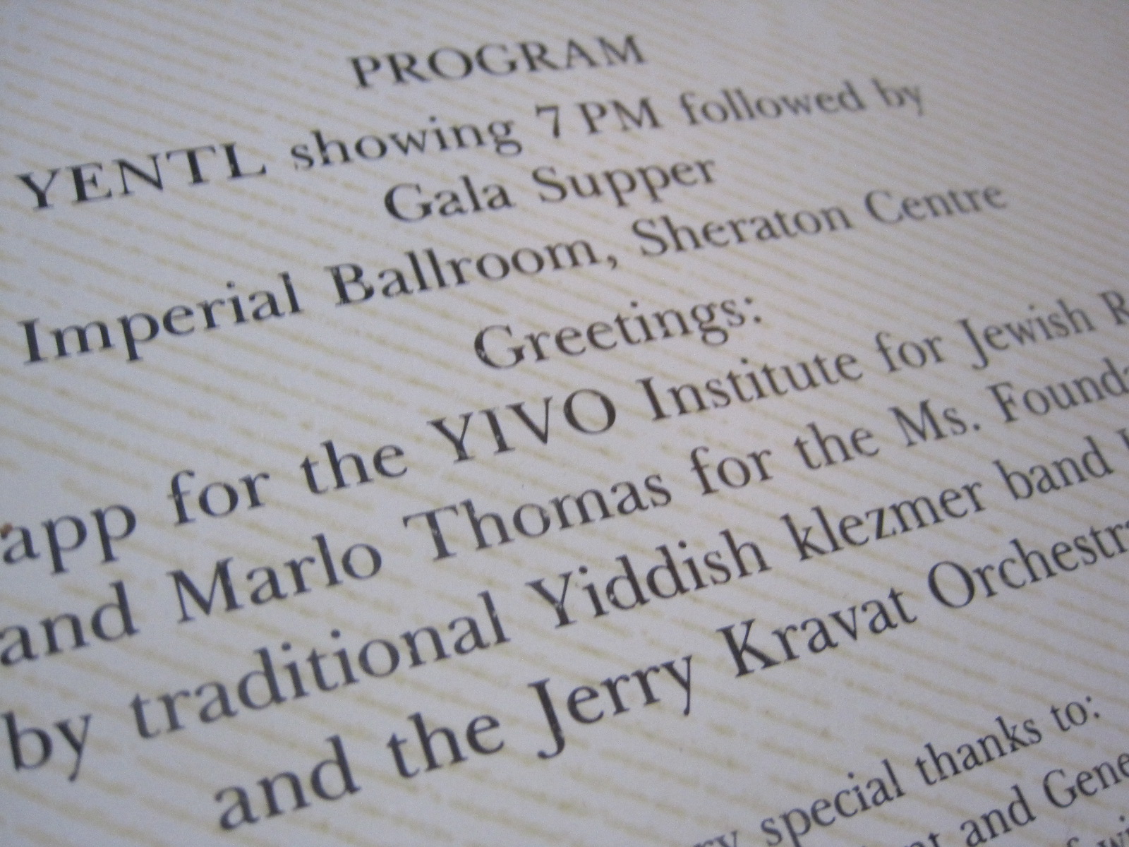 After leaving the Ziegfeld Theatre the main issue was getting ourselves over to the Imperial Ballroom at the Sheraton Centre for the Gala Supper. A splendid affair was planned for us, no doubt. Greetings from Joseph Papp for the YIVO Institute for Jewish Research. Gloria Steinem and Marlo Thomas for the Ms. Foundation for Women. Music by traditional Yiddish klezmer band KAPELYE and the Jerry Kravat Orchestra. And I’m quoting from my original invitation.