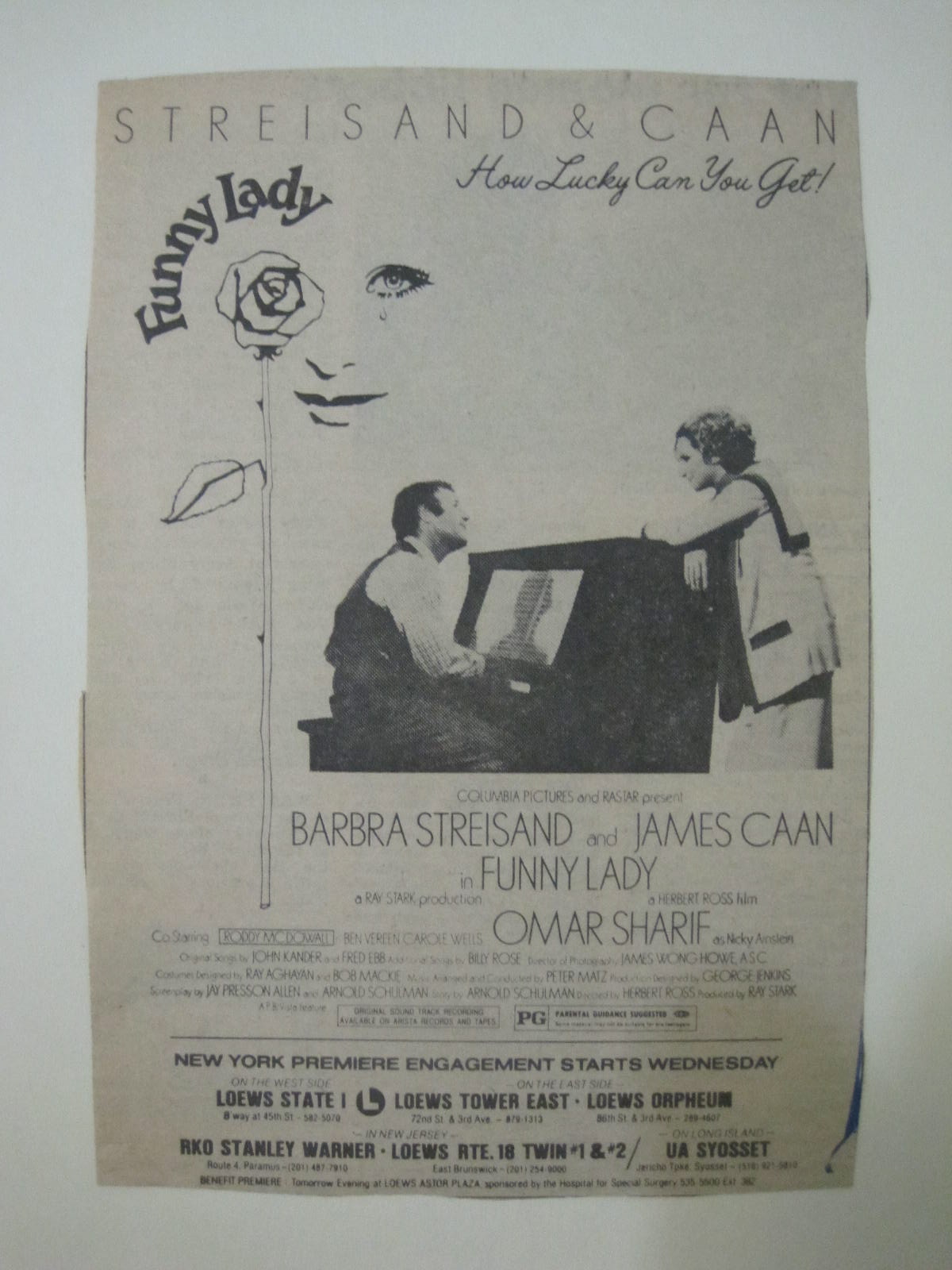 In March of 1975 John and I (along with Jason Barrett – another childhood friend who came along for the ride) jumped on the subway and went downtown to wait outside the ‘Funny Lady’ premiere. We did this right after school let out so we were the very first ones there, even before they put up the barricades. John had made a sign out of a bed sheet, I brought the poster from the “Live at the Forum” album and we got on television and everything. WABC-TV Eyewitness News put these words under our clip: “Streisand’s Greatest Fans”. That’s because that is who we told them we were.
