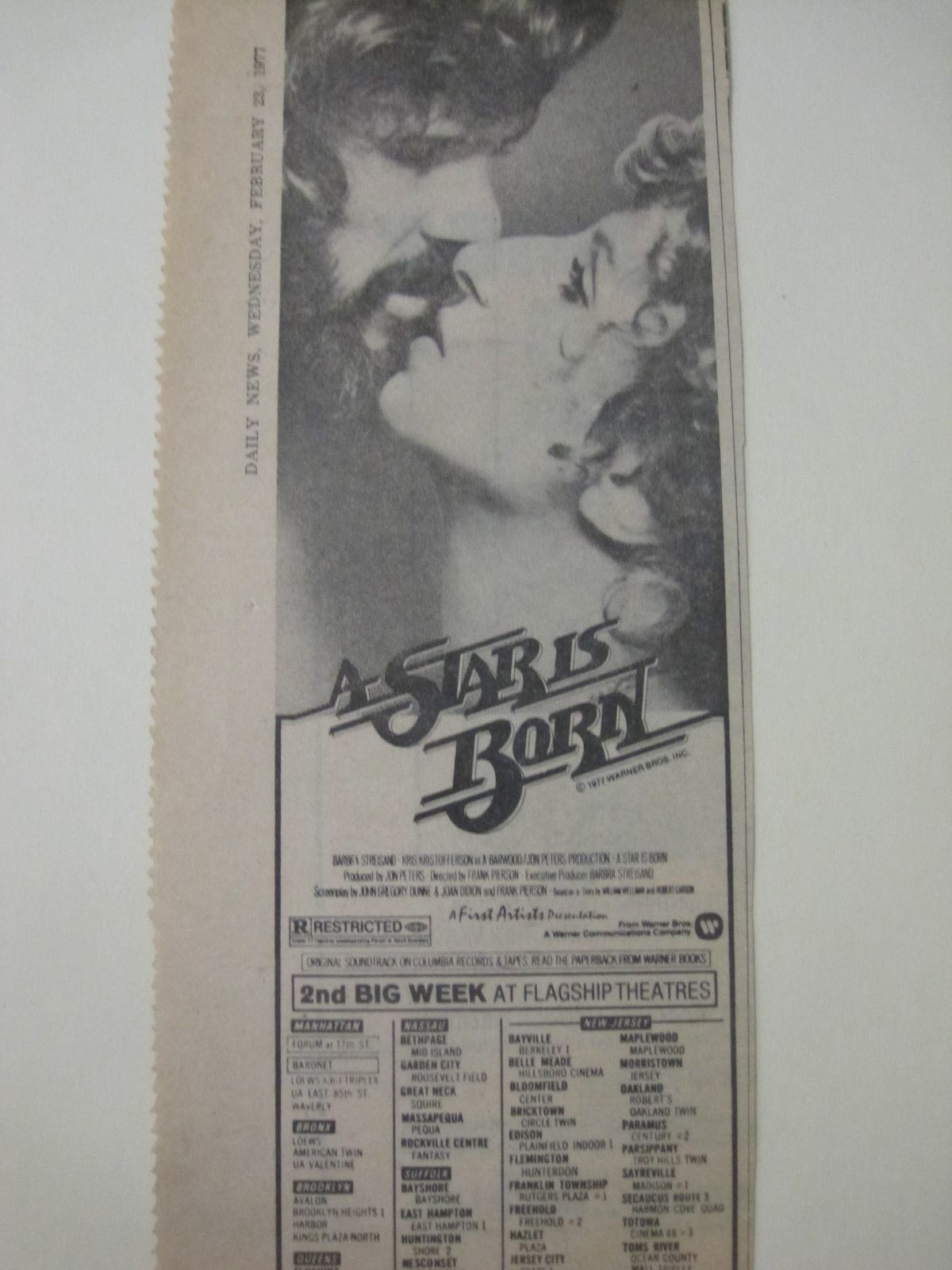 I think I heard it on the radio, or maybe there was an ad in the paper?  No, I think it was the radio, possibly WPLJ – for some reason that sticks in my head.  But the news of the day was that later that evening a press preview was being held for ‘A Star is Born’ at the Ziegfeld Theatre.  They didn’t call it a premiere – but some lucky fan could call in and win tickets to the screening.  Not being lucky I didn’t even dial but decided to hop on the subway and see what was going on.  This was the most talked about movie of the year and I couldn’t wait to see it.
