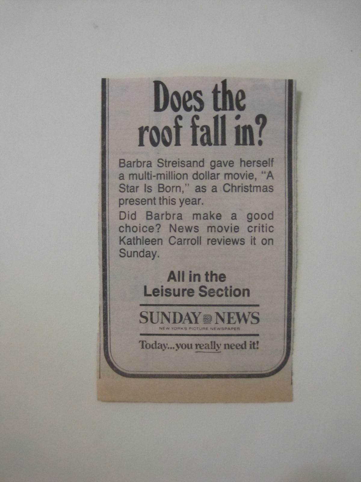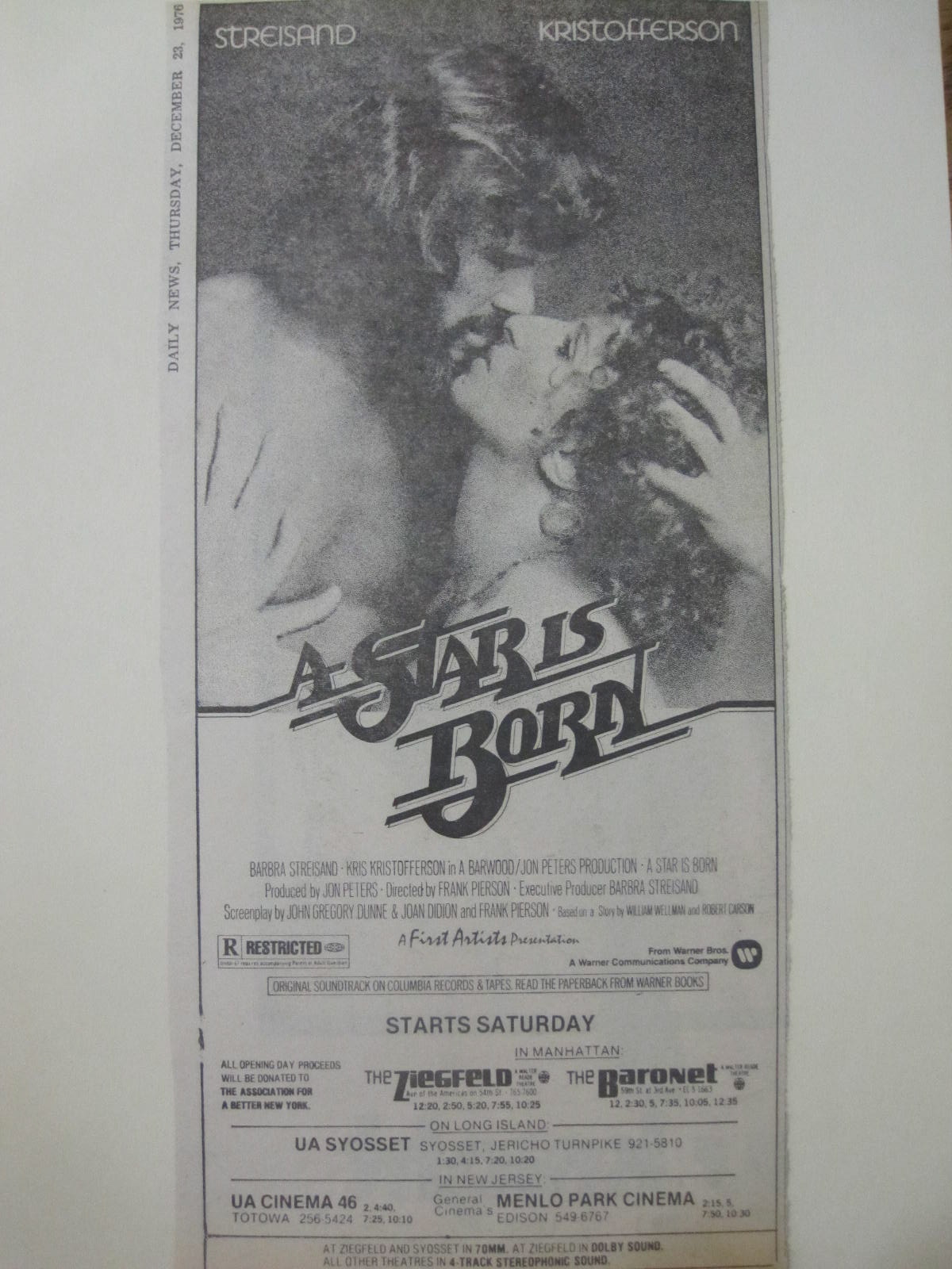 And that’s how I got to see ‘A Star is Born’ before Christmas Day.  There was no way my mother would allow me to go to the movies on Christmas Day, the day the picture opened, and this was, truly, ‘The Best Gift’ I ever got.  Although that sounds ungracious to all the wonderful socks and sweaters my mother bought for me; she tried, she really did try, and she would take my list of Barbra records around in her bag every Christmas shopping season – but this ticket to ‘A Star is Born’ was truly out of the ball park.