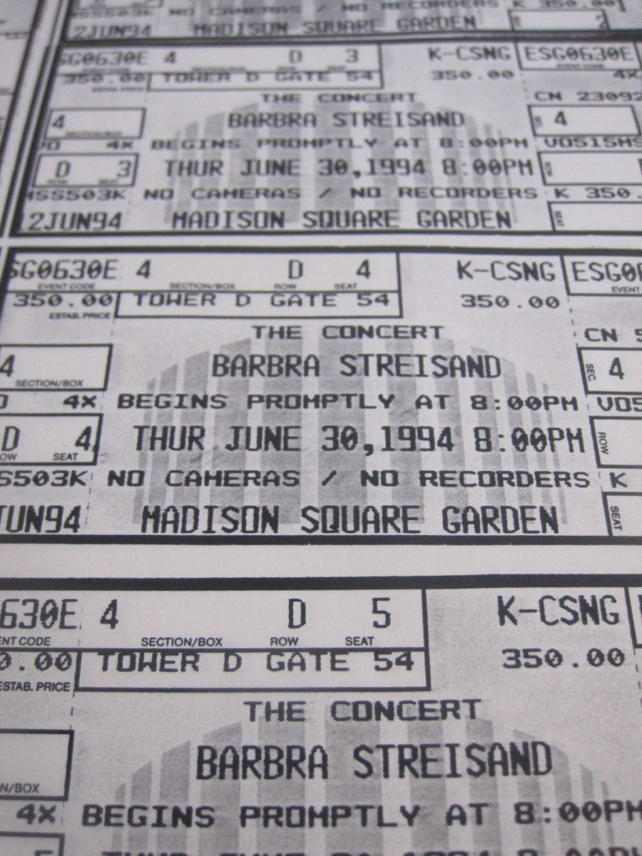 Barbra Streisand The Concert Closing Published February 17, 2014 at 1200 × 1600 Our tickets for “closing” night. Until more shows were added, but we didn’t care. Share this:Tweet Email a link to a friend (Opens in new window) Email Print (Opens in new window) Print Share on Reddit (Opens in new window) Reddit Share on TumblrPocketLike Loading...